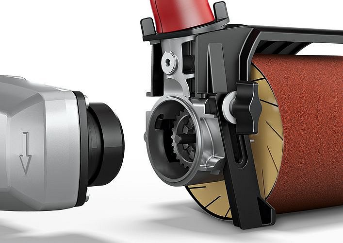 - Originální příruba s rychlospojkou pro výměnu systémových brusných nástavců na satinování a pásové broušení trubek